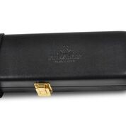Black leather cue case. Peradon hand made leather cases are truly stunning cases. Whilst many alternative cases may look good in photographs these cases are skillfully constructed by hand down with attention right to the smallest detail. They are constructed as a wooden case which is then beautifully upholstered with the finest quality leather on the exterior and with suede leather on the padded interior which holds the cue in place. The smooth rounded leather case ends are testament to the skill of the case maker. The solid brass hinges and catches are of the highest quality as are the leather straps and buckles. The interior of the case has an agled divider to neatly hold a two piece cue in place and a separate compartment for storage of chalk. The exterior of the case is embossed with the distinctive Peradon trademark.